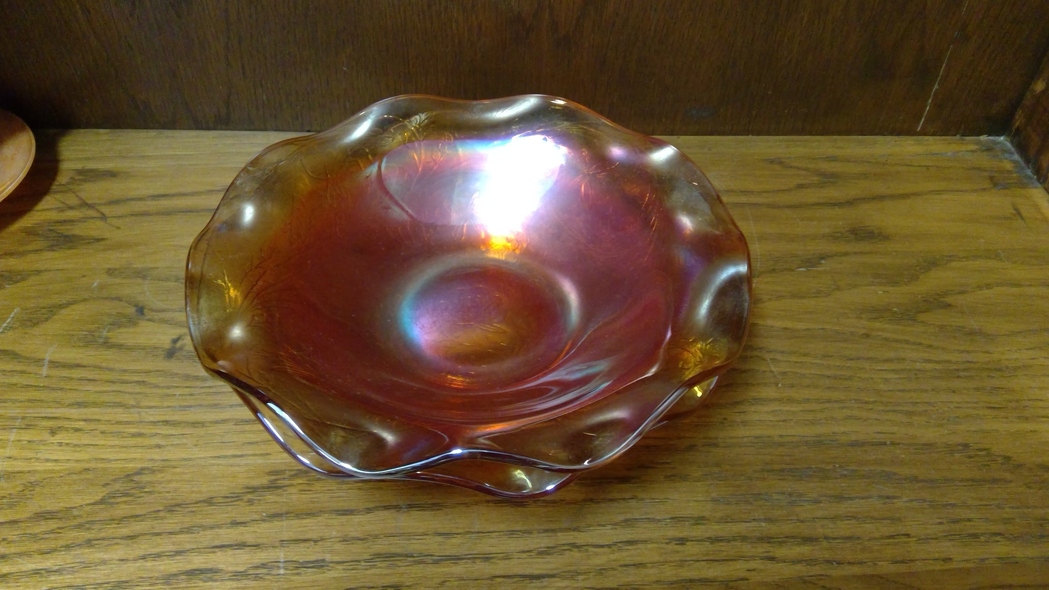 2pc set of Vintage Carnival glass bowls, in Marigold Orange Louisa patttern wiht scalloped edges By Jeannette Glass. In decent condition, some scratches in both bowls, from between the 1950-1970s