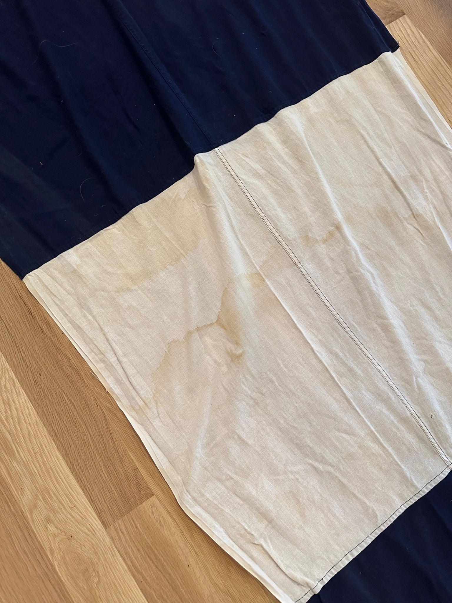 This is a very long nautical flag or vintage boat flag. Feels very polo Ralph Lauren! A great alternative to maritime art for a wall. Could also be a table runner for a fun nautical wedding. It is well-worn and a great decor item for a beach home or boat enthusiast. Due to its length it could be a great wall hanging in various configurations in a tall space.