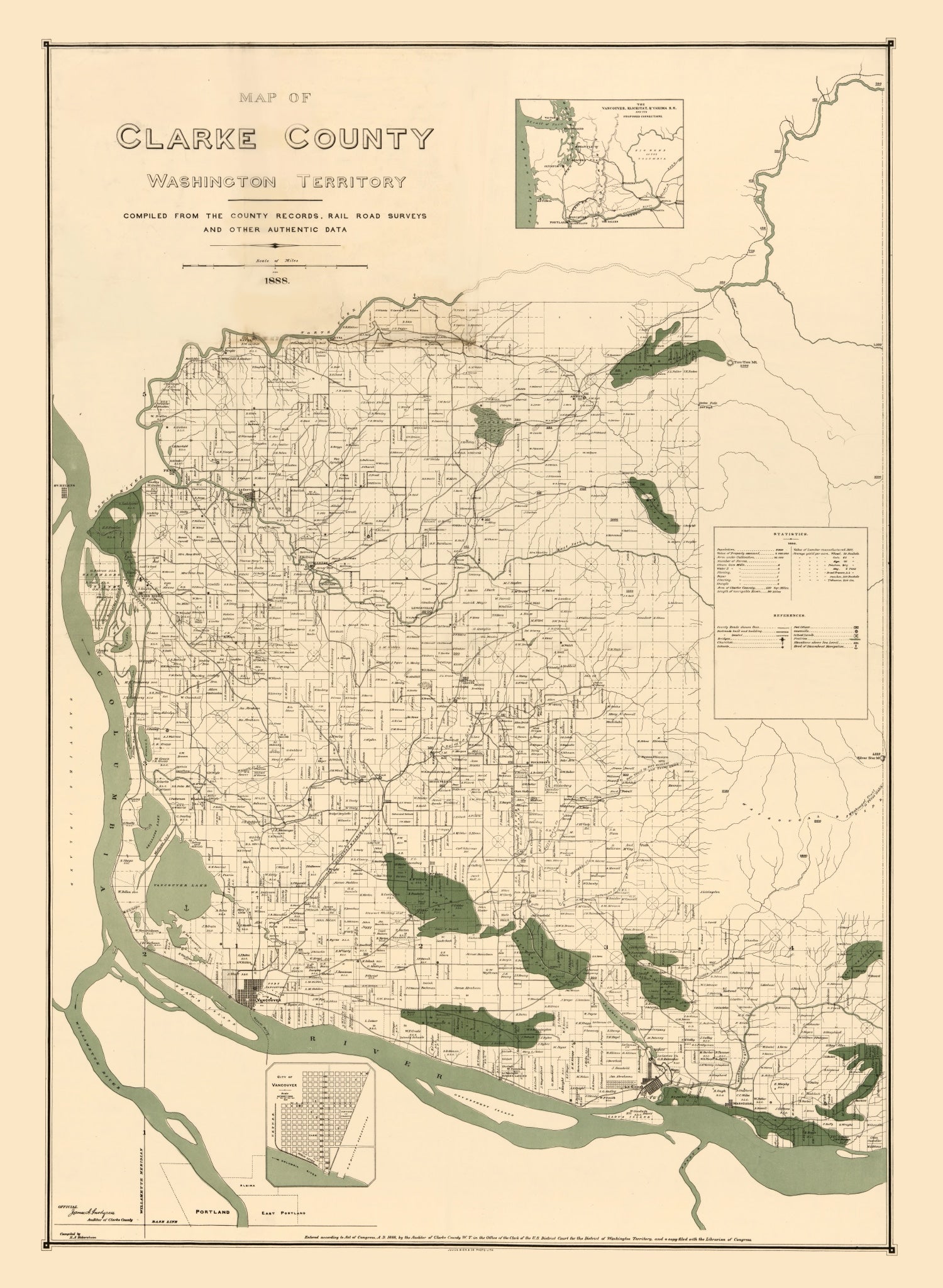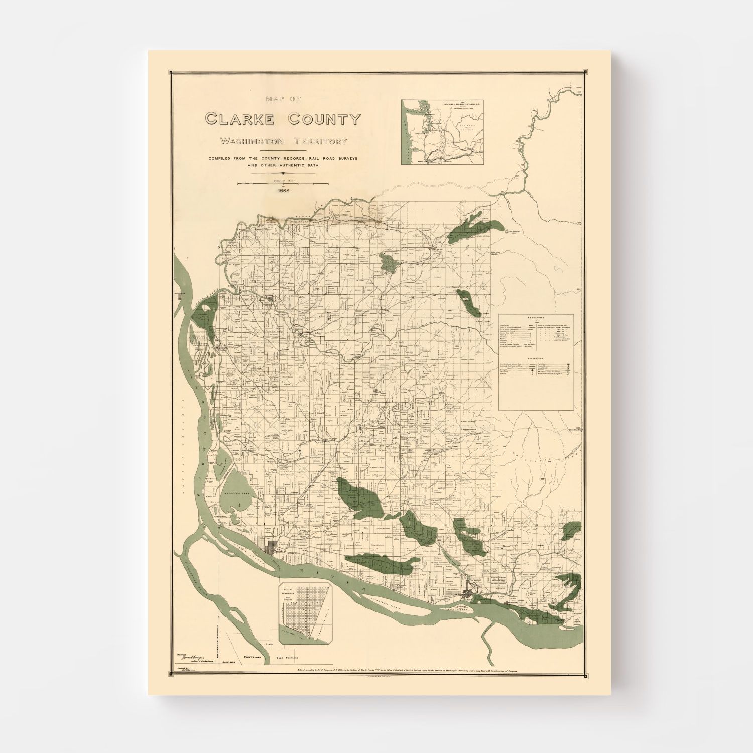 Discover a piece of history with our beautifully restored 1888 map of Clark County, Washington. Perfect for history buffs or anyone who loves a classy touch in their home or office. This print highlights notable towns in the area like Vancouver and Ridgefield, making it not only a stunning decor but also a delightful conversation starter.