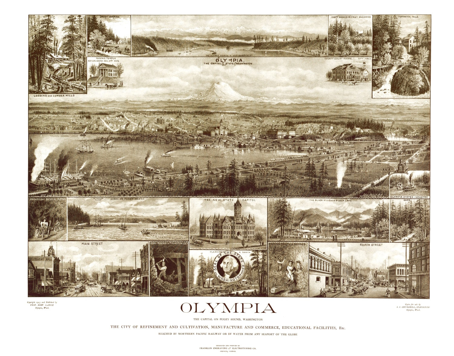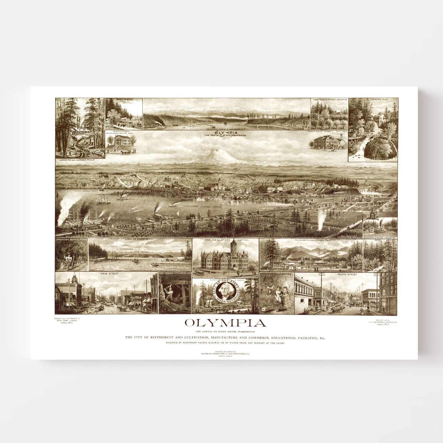 The craftsmanship speaks for itself—whether you choose an elegant framed option made from stained solid wood or a hand-stretched canvas on polycotton, you're getting an artwork that complements both home and office spaces. If you prefer flexibility, our high-quality matte paper prints offer a sleek look that's easy to incorporate into any design theme. This map isn't just wall art; it’s a conversation starter that brings life and character wherever it's displayed. Discover the charm of Olympia from over a century ago with this timeless piece.