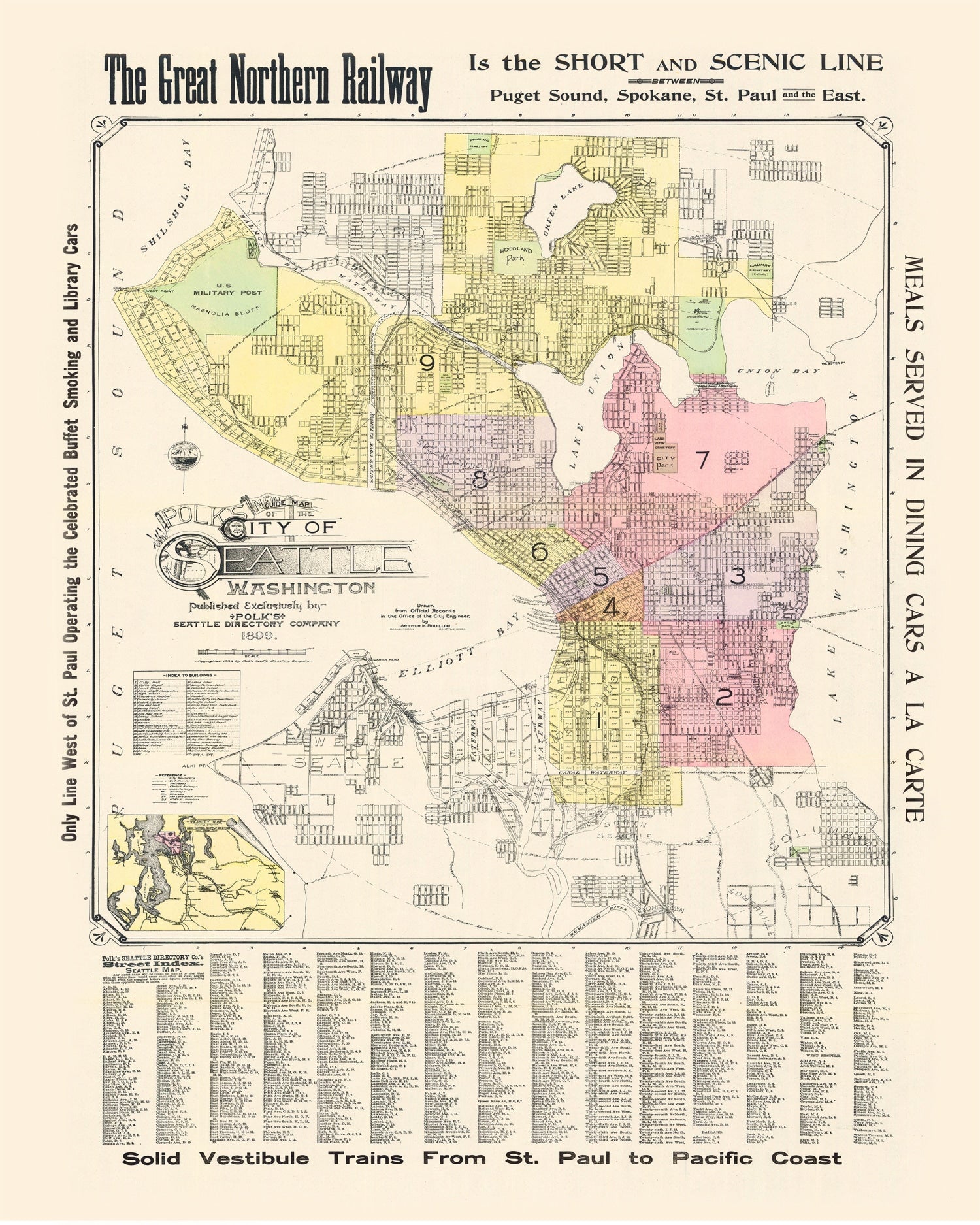 Step back in time with our beautifully restored vintage map of Seattle, from the year 1899. This historical piece showcases King County in Washington with remarkable detail and craftsmanship. Each map is more than just décor; it's a celebration of local history that adds character to any room.