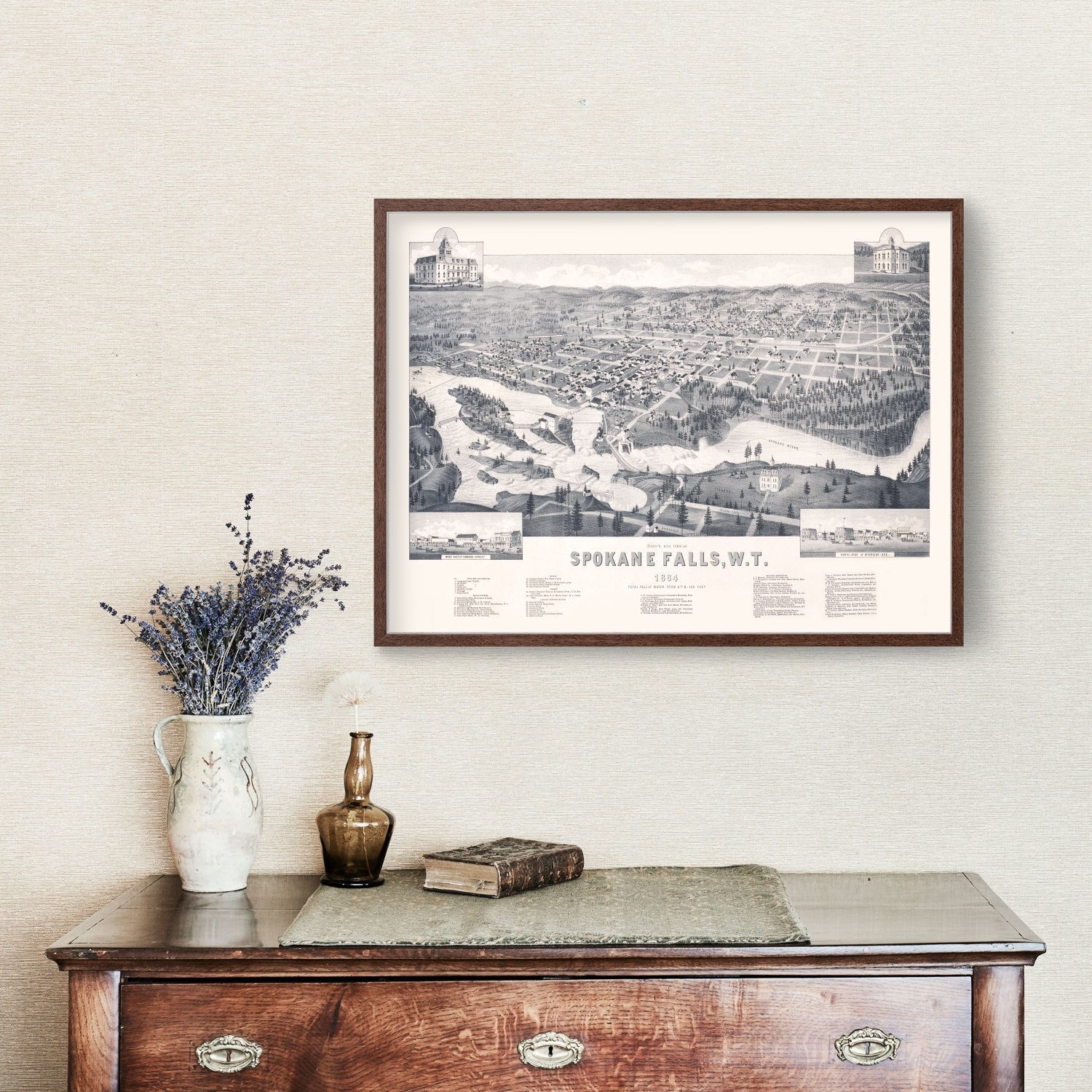 This beautifully restored vintage map of Spokane Falls from 1884 is a wonderful way to celebrate local history. Perfectly capturing the essence of Spokane County, Washington, this piece makes for an ideal gift for history enthusiasts or anyone with a fondness for the area. Whether you're looking to add some charm to your home or office, this piece's traditional design will fit right in.