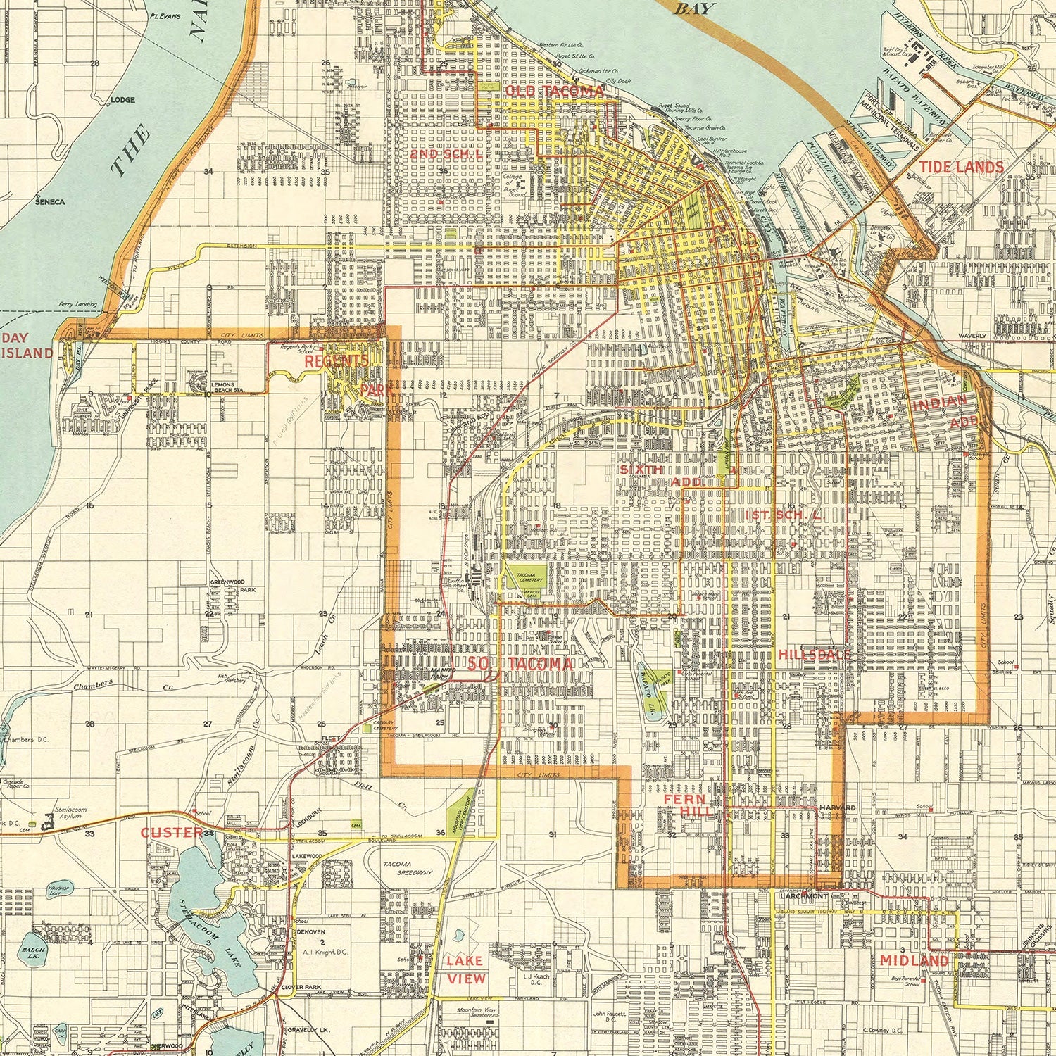 Discover the charm of Tacoma, nestled in Pierce County, Washington, with this exquisite 1923 vintage map print. Professionally restored by Ted's Vintage Art, this piece breathes new life into a historic snapshot of the area. Whether you're a history enthusiast or simply love unique decor, this map brings both tradition and class to any space—be it home or office.