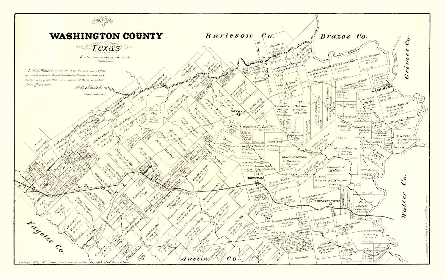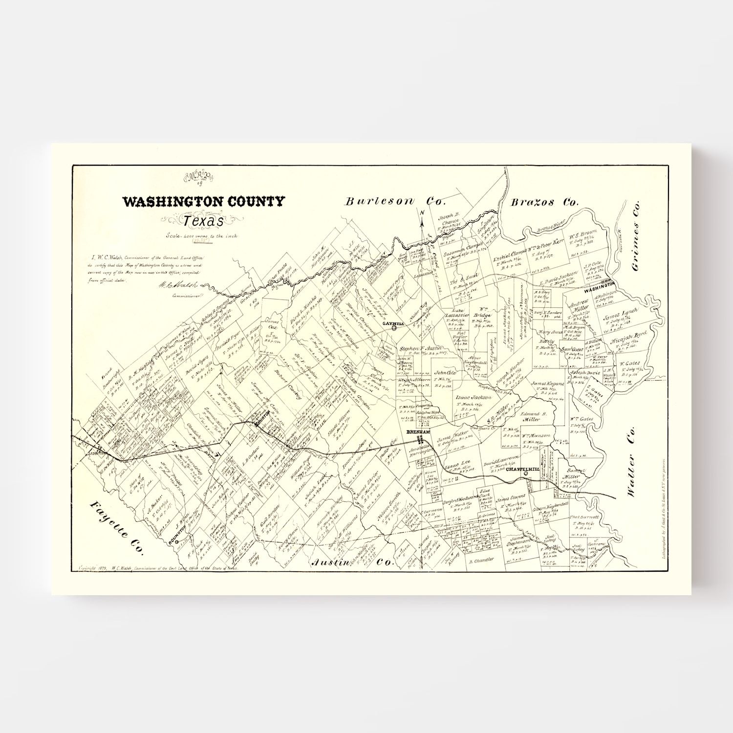 Discover the rich history of Washington County, Texas, with this beautifully restored 1879 vintage map. This piece isn't just a map; it's a window into the past, capturing towns like Brenham and Burton that are central to the county's heritage.