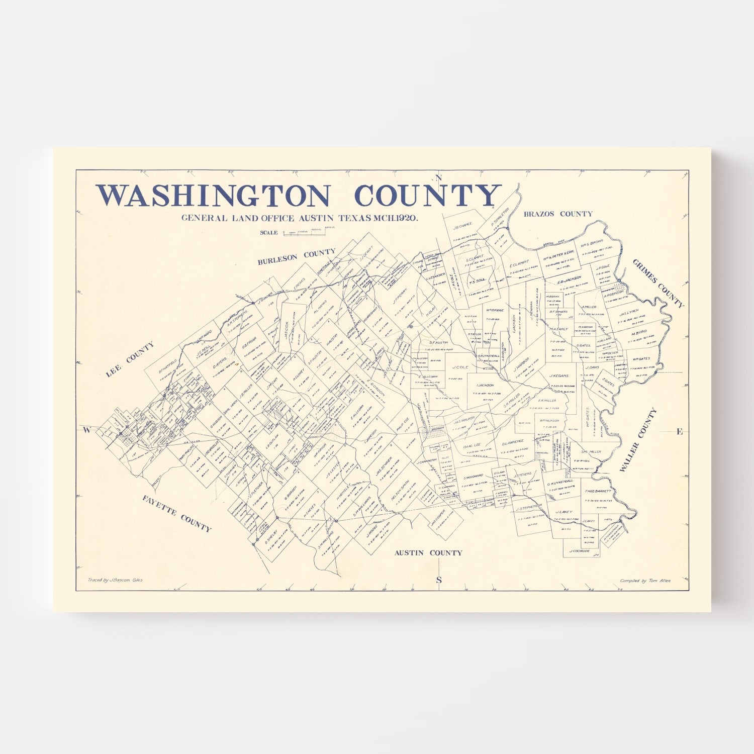 Discover a piece of history with our beautifully restored 1920 map of Washington County, Texas. Perfect for those who cherish local heritage, this map serves as both an intriguing conversation starter and a stylish piece of decor for your home or office. Crafted with quality materials, each print is ready to hang and constructed by hand. Our frames are solid wood with an elegant stain finish, while the canvas versions feature polycotton stretched over sturdy wood bars.
